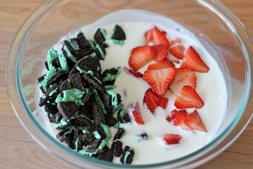 Stir in the diced strawberries and crumbled Oreos.
