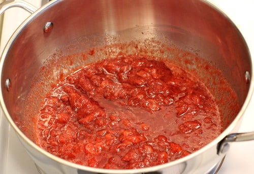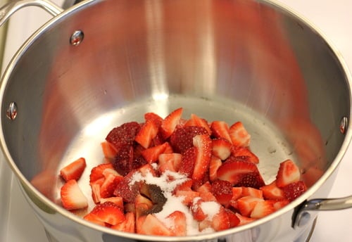 Let’s first start with the super easy strawberry balsamic jam by combining some fresh strawberries, sugar and balsamic vinegar in a medium saucepan.