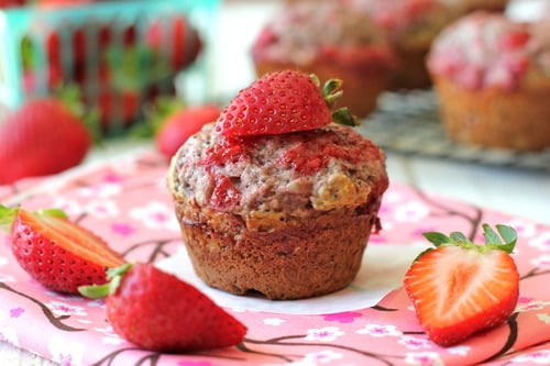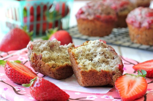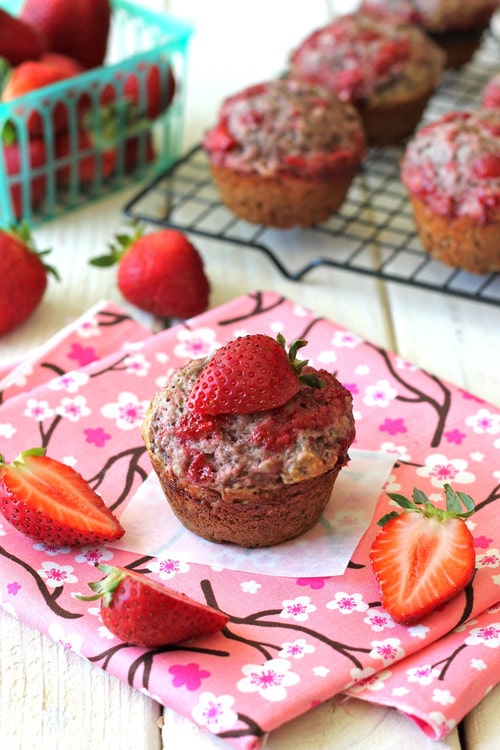Anyway, for today’s #MuffinMonday, I have a special treat for you guys. I made strawberry muffins but instead of packing them with fresh strawberries, I made a super easy strawberry balsamic jam and mixed that right into the batter along with some poppy seeds to give it that extra crunch. Then, at the last minute, I decided to use the leftover jam (no need to be wasteful, right?) to top these babies off before popping them into the oven. These muffins were wonderfully fresh, light/moist and chock full of strawberries built right into the batter, making it the perfect breakfast muffins!