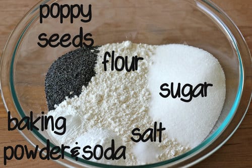 In a large bowl, combine the flour, poppy seeds, sugar, baking soda, baking powder and salt.