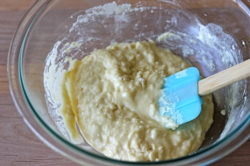 Then we’ll combine the wet to dry, using a rubber spatula to ensure that we don’t overwork the batter.