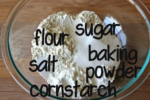 In a large bowl, combine flour, sugar, cornstarch, baking powder and salt.