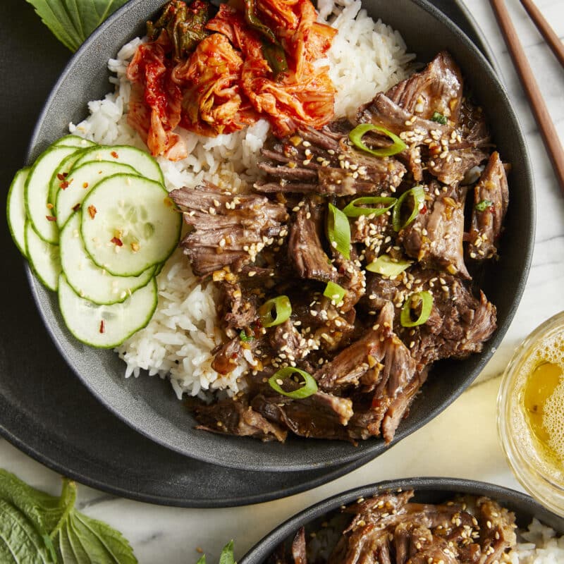 We love to serve this over rice and a side of kimchi and cucumbers.