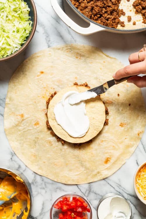 This is key for that “crunch” in a crunch wrap supreme, and also serves as a barrier from the colder ingredients (sour cream, lettuce and tomato).