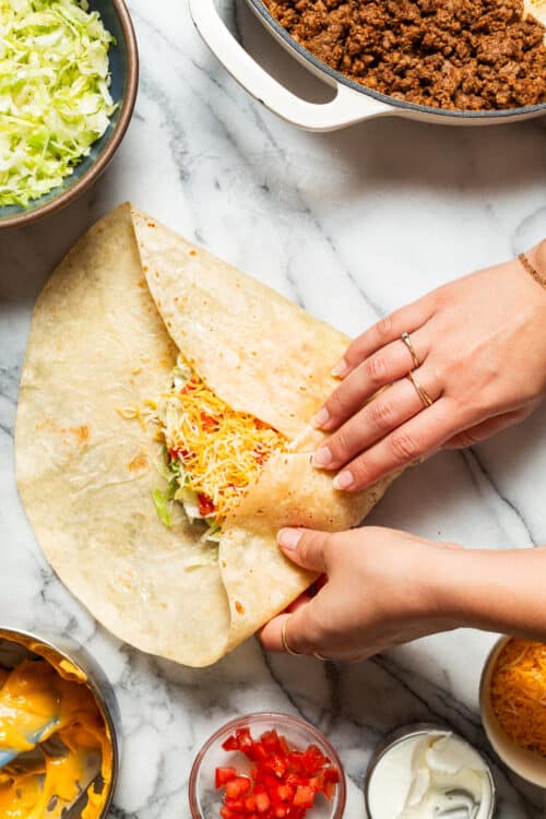 Fold the edges up and over the center. Continue to work your way around the tortilla, folding as tight as possible.