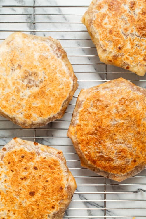 Fold tightly. Fold the edges up and over the center as tightly as possible, cooking seam-side down first to seal the folds and preventing the filling from spilling out.