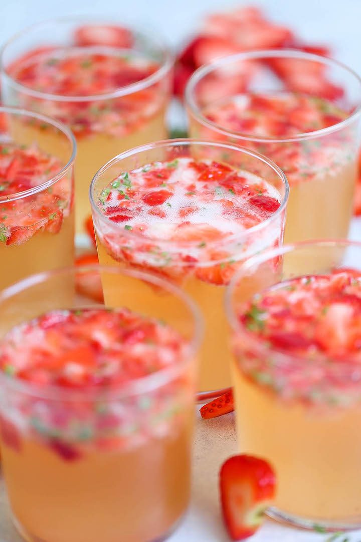 - Pour strawberry mixture into champagne flutes until half full. Fill glasses with white wine.