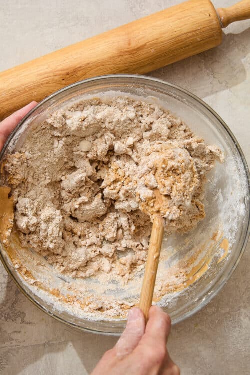 - Using a pastry cutter, fingertips, or two forks, cut the cold butter into the dry ingredients until it resembles coarse crumbs (freeze for 10 minutes)