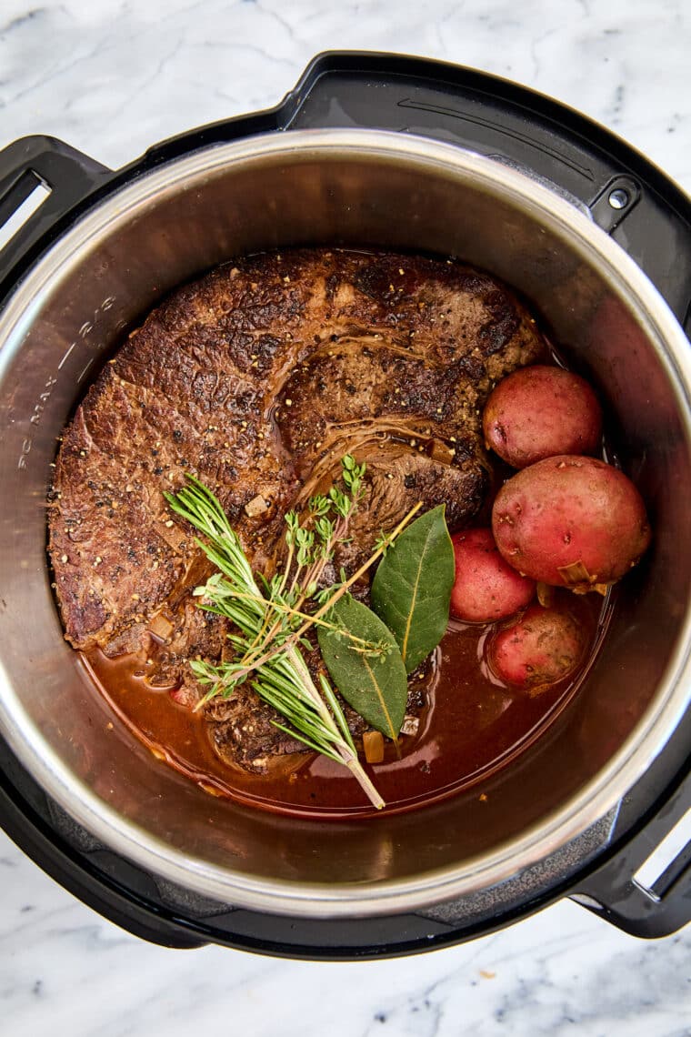 - Stir in beef stock, Worcestershire, thyme, rosemary and bay leaves. Top with beef. Select manual setting; adjust pressure to high, and set time for 45 minutes. When finished cooking, quick-release pressure according to manufacturer’s directions.