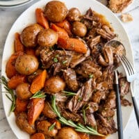 So damn delicious! I had adjusted the recipe for a 2.15 pound boneless chuck roast and reduced the cooking time to compensate for smaller roast (oops…my bad for the adjustment). I had to put the center roast part (soft ball size) back in to cook for another 25 minutes because it wasn’t wanting to shred easily like the outer part did (a little tougher I guess). There was plenty already shredded for dinner. The meat, potatoes, and carrots were just so tasty, and the gravy was just the right consistency. I can’t say enough nice things about the flavor and simplicity of this recipe. Thank you so much for sharing it!