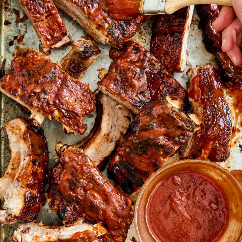 - Place ribs, meat side up, in a single layer onto the prepared baking sheet; brush with barbecue sauce.