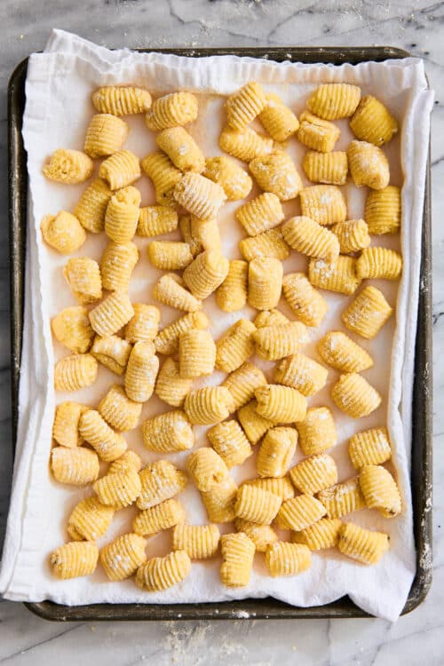 - In a large pot of boiling salted water, cook gnocchi in batches until tender, stirring occasionally, about 2-3 minutes. Drain well using a slotted spoon and transfer to a clean rimmed baking sheet.