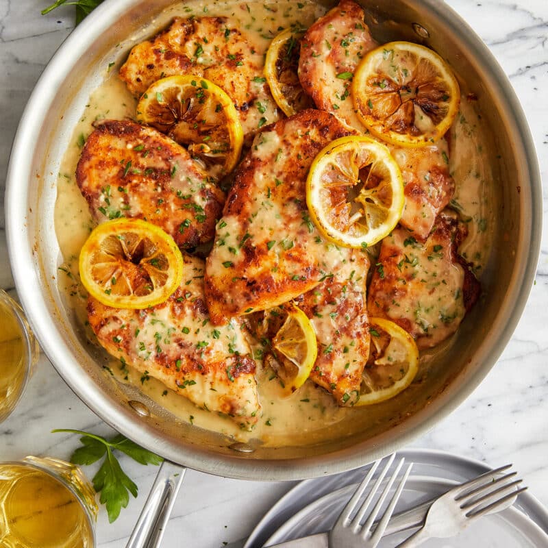 - Family-friendly. Not only does this come together super quickly, but this will surely please everyone in the family, even the pickiest eaters. The pan-fried parmesan-coated chicken bathed in lemony, garlicky cream sauce – who can resist this goodness?
