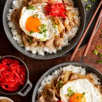 Gyudon is traditionally served with a raw egg yolk (or fried egg, if desired), pickled ginger, green onions and sesame seeds. Or sometimes we just serve over microwave rice when there isn’t enough time!