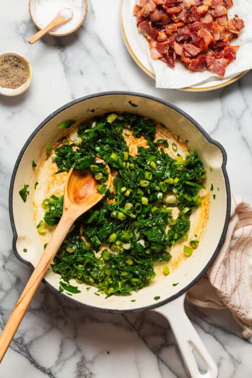 - Working in batches, add spinach, and cook, stirring occasionally, until wilted and excess liquid has evaporated, about 5 minutes. Stir in green onions; remove from heat.
