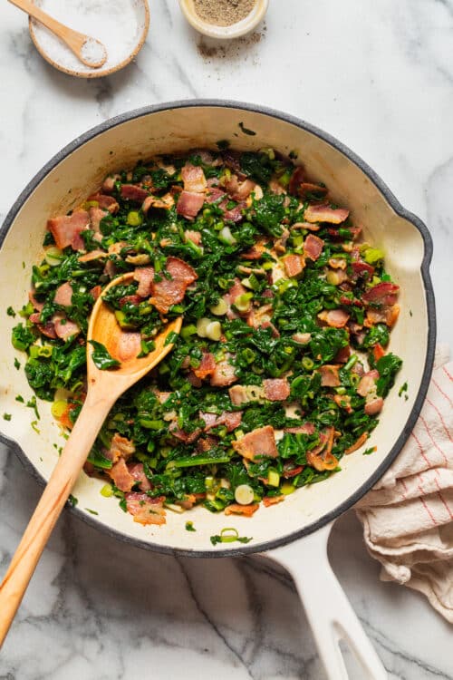 - Heat a large cast iron skillet over medium high heat. Add bacon and cook until brown and crispy, about 6-8 minutes. Drain excess fat, reserving 1 tablespoon in the skillet; transfer bacon to a paper towel-lined plate.