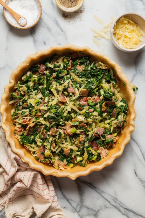 Bacon and spinach is a classic quiche filling combination, but various meat and vegetable options can also be added or swapped out as needed.