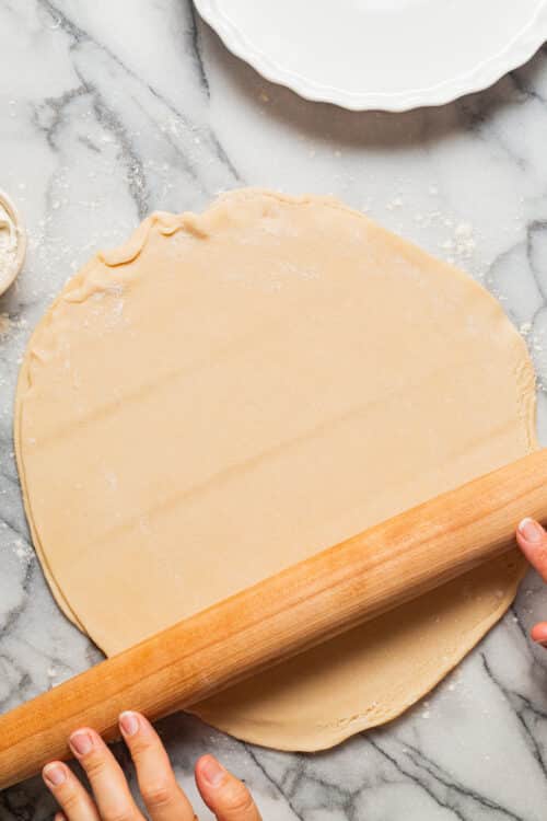 - Unroll both pie doughs on a lightly floured surface. Brush 1 pie dough lightly with 1 1/2 teaspoons water. Place remaining pie dough on top, rolling to a 15-inch circle.