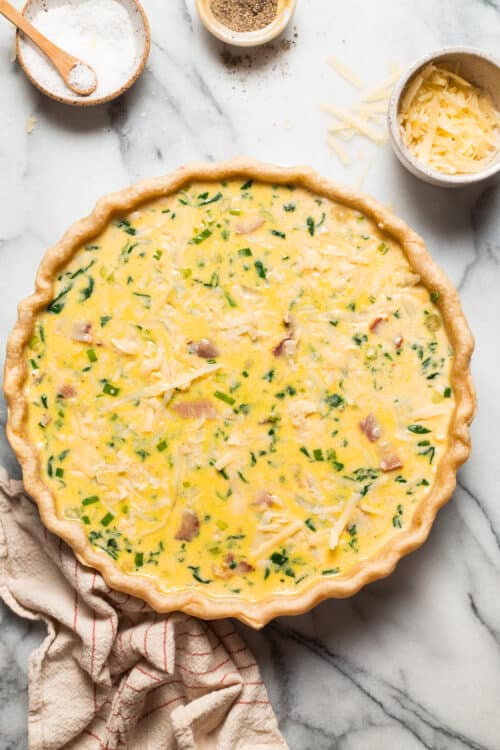 The eggs provide the base and foundation for the most perfect quiche, serving as a binder to hold everything together for a creamy, savory custard.