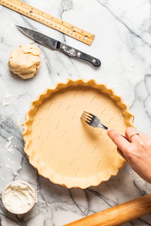 - Using a fork, pierce the bottom of the dough. Place in the freezer for 10 minutes.