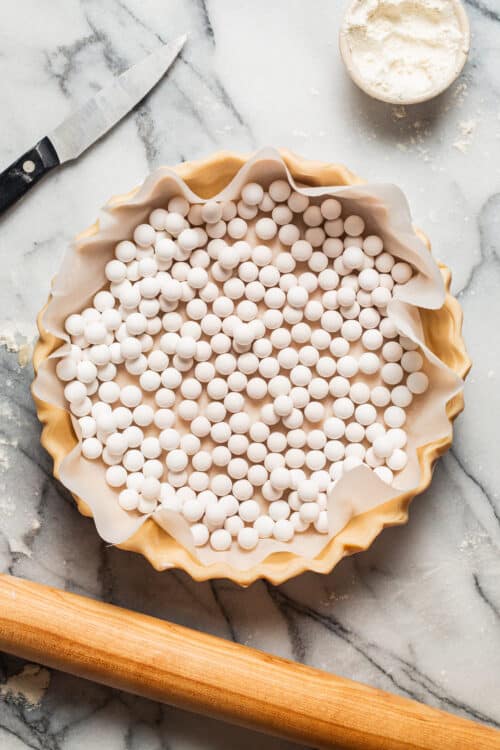 - Arrange an oven rack on the lowest part of the oven and preheat to 375 degrees F. Line the pie crust with parchment paper, filling with pie weights.