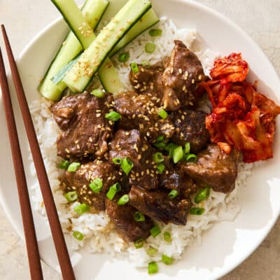 In a large bowl, whisk together beef broth, soy sauce, brown sugar, garlic, sesame oil, rice wine vinegar, ginger, Sriracha, onion powder and white pepper.
